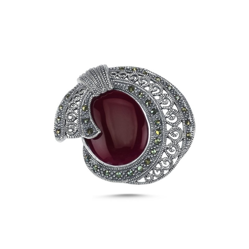 Kırmızı Akik & Markazit Taşlı Gümüş Broş