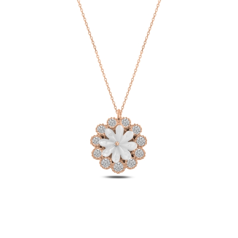 Rose Kaplama Çiçek Sedef & Zirkon Taşlı Gümüş Bayan Kolye