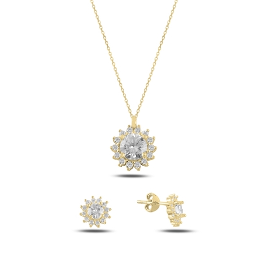 Altın Kaplama Halo Tektaş Zirkon Taşlı Gümüş Bayan Set