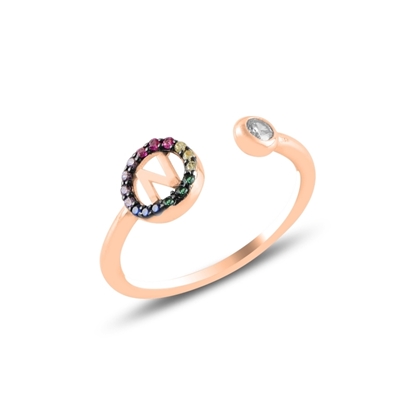 Altın Kaplama -N- Harfi Renkli Zirkon Taşlı Ayarlanabilir Boylu Gümüş Bayan Yüzük