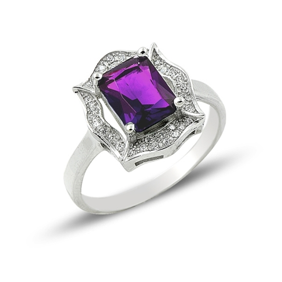 Rodyum Kaplama Ametist Zirkon Taşlı Tektaş Gümüş Bayan Yüzük