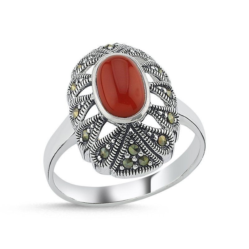 Kırmızı Akik & Markazit Taşlı Gümüş Bayan Yüzük