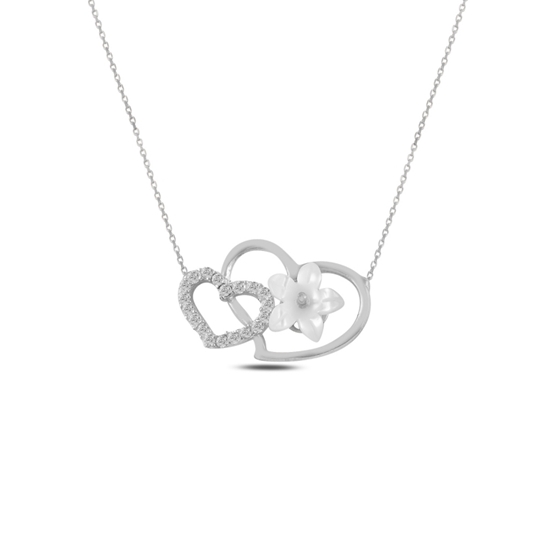 Rodyum Kaplama Çiçek Sedef & Kalp Zirkon Taşlı Gümüş Bayan Kolye