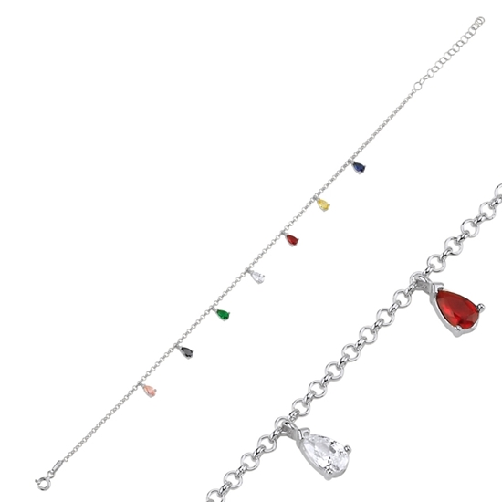 Rodyum Kaplama Renkli Zirkon Taşlı Doç Zincirli Sallantılı Halhal