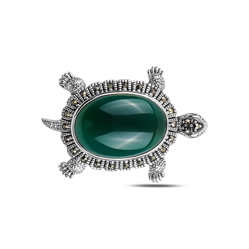 Yeşil Akik Kaplumbağa Doğal Taş & Markazit Taşlı Gümüş Broş & Gümüş Bayan Kolye Ucu