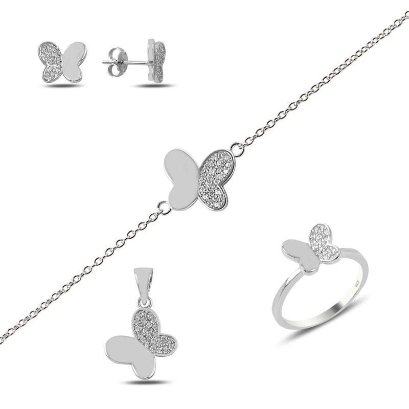 Rodyum Kaplama Zirkon Taşlı Kelebek Gümüş Bayan Set